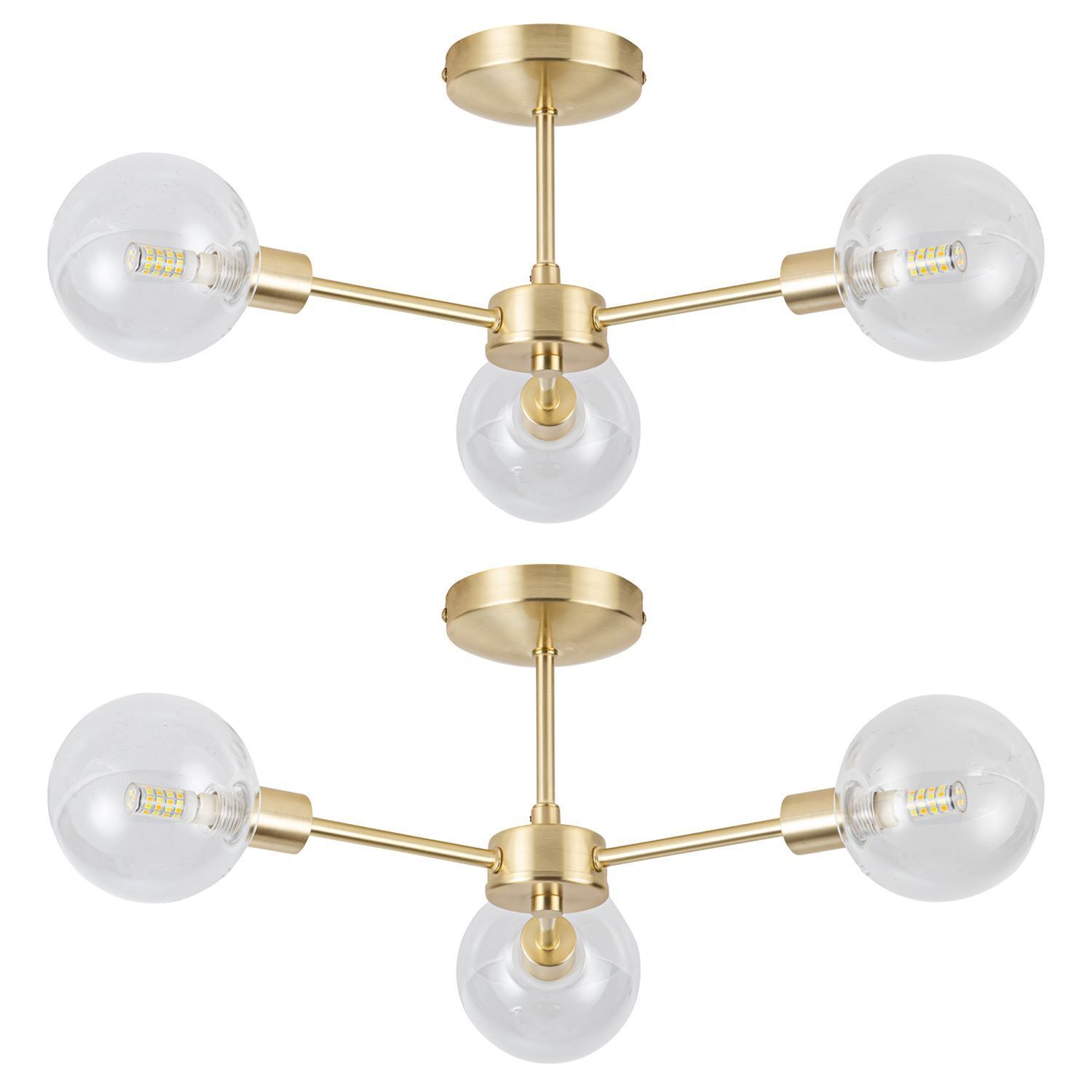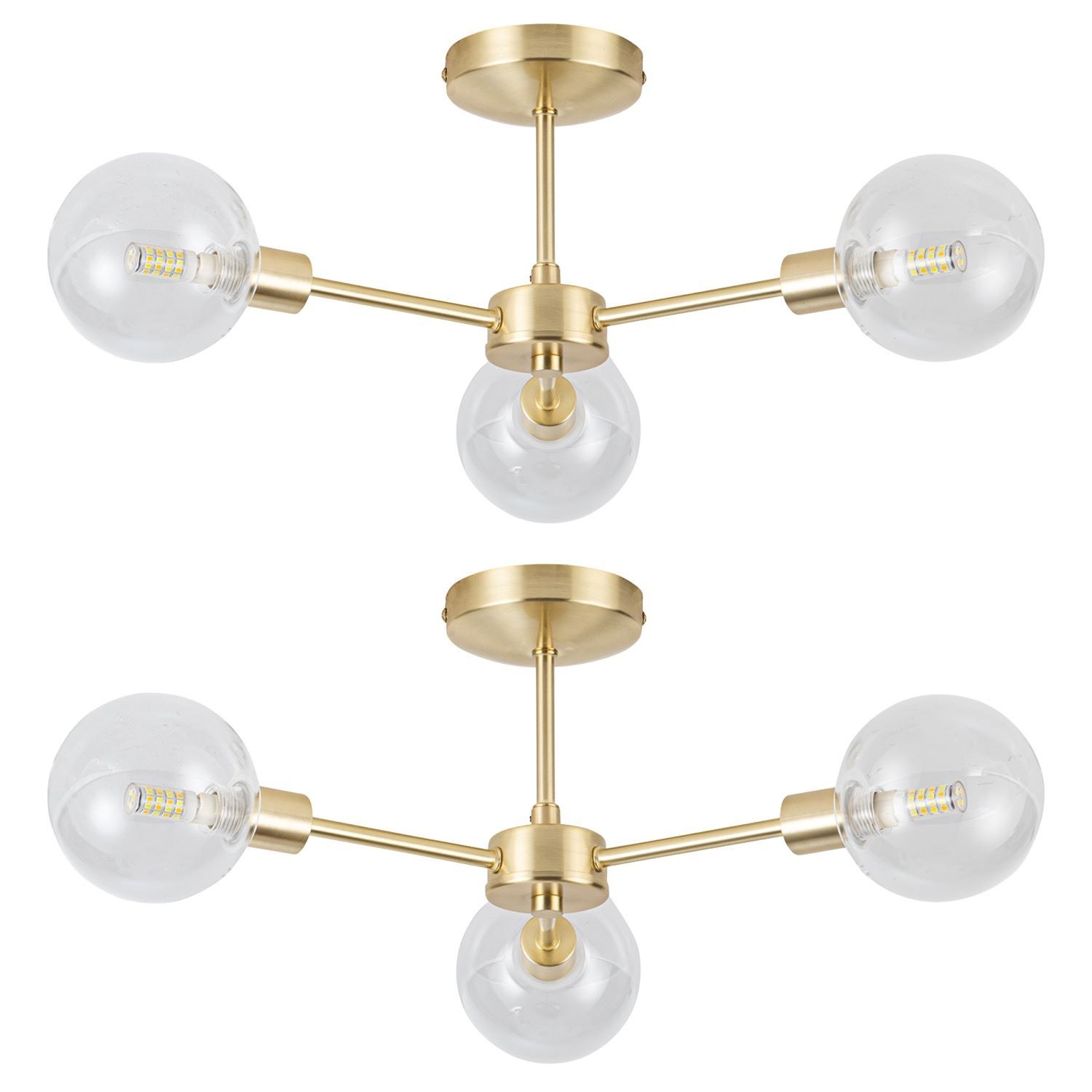Set of 2 Satin Brass Gold with Clear Glass 3 Arm Ceiling Light Lamp Fittings