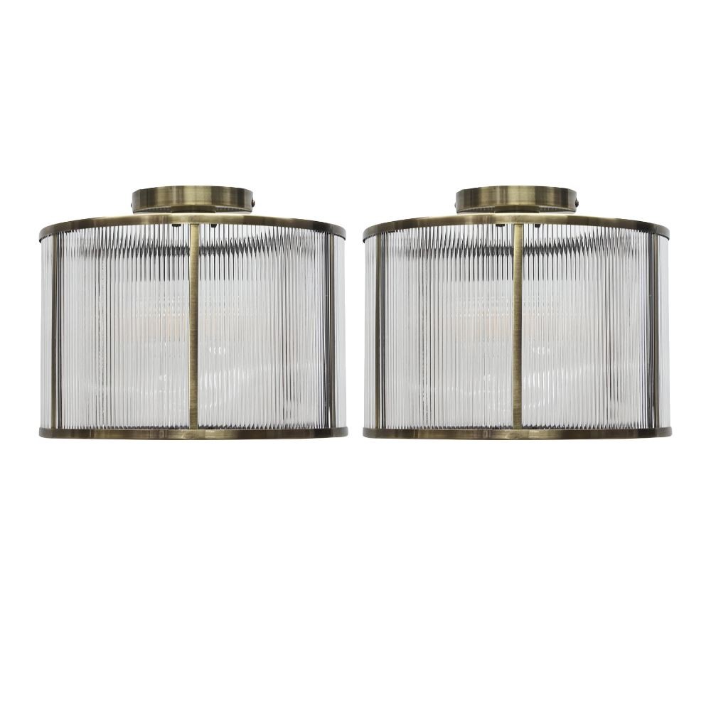 Set of 2 Modern Antique Brass With Ribbed Diffuser Flush Ceiling Light Fittings