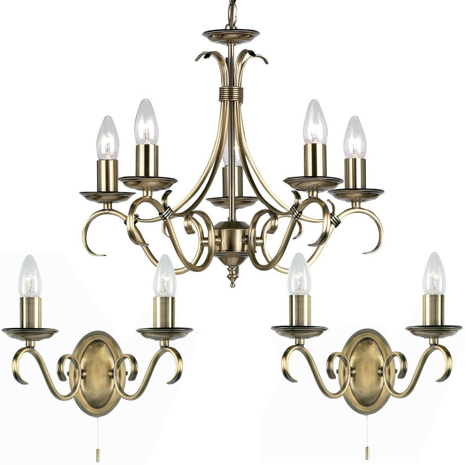 5 Lamp Ceiling & 2x Twin Wall Light Pack Antique Brass Vintage Matching Fittings