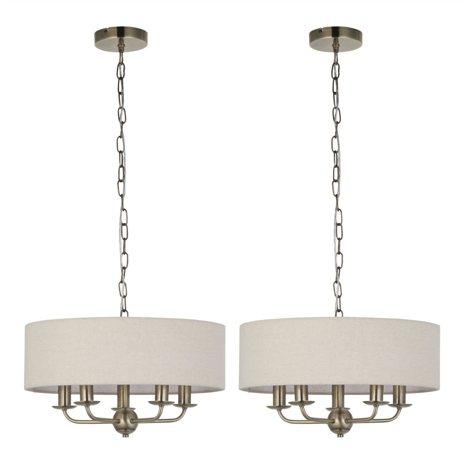 Set of 2 Antique Brass Ceiling 5 Light Pendant Fittings 45cm Linen Shade