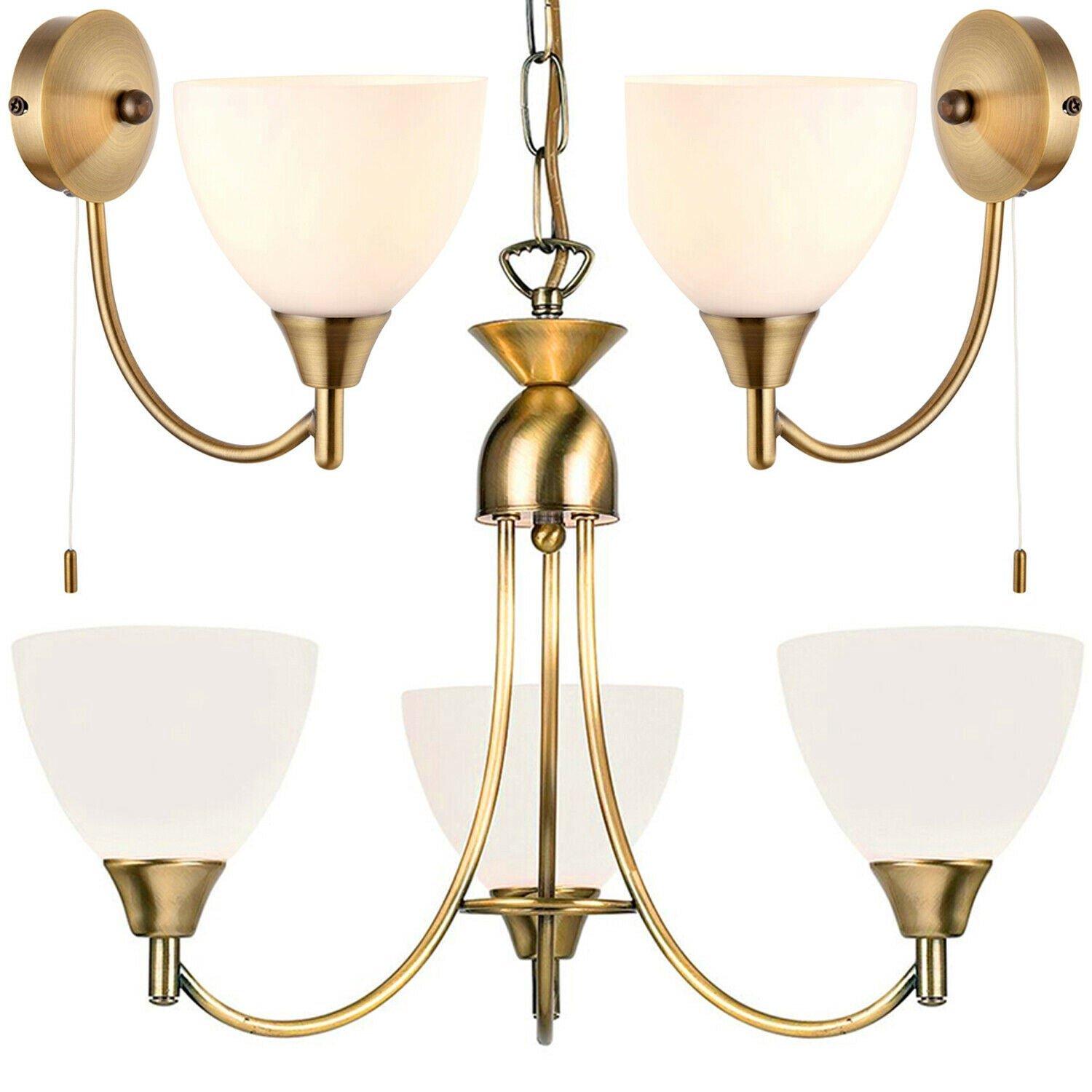 3 Lamp Ceiling & 2x Wall Light Pack Antique Brass Glass Matching Indoor Fittings