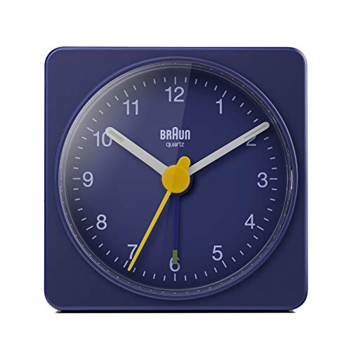 Braun Classic Travel Analogue Alarm Clock, Compact Size, Quiet Quartz Movement, Crescendo Beep Alarm in Blue, model BC02BL.