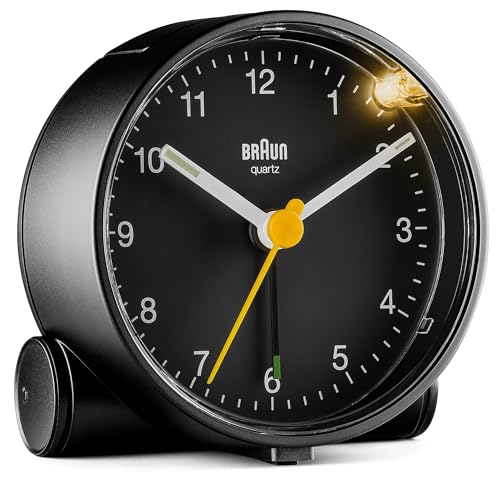 Braun Classic Analogue Alarm Clock with Snooze and Light, Quiet Quartz Movement, Crescendo Beep Alarm in Black, model BC01B.