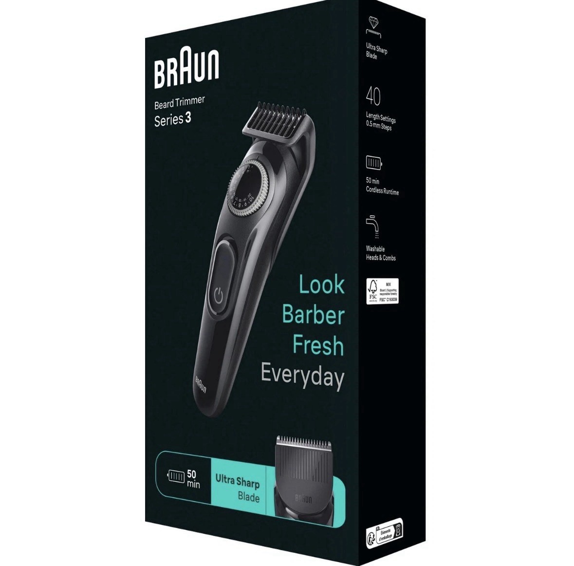 Braun Beard Trimmer Series 3, plus 4 Styling Tools, Ultra Sharp Blade, 50 Min Ru