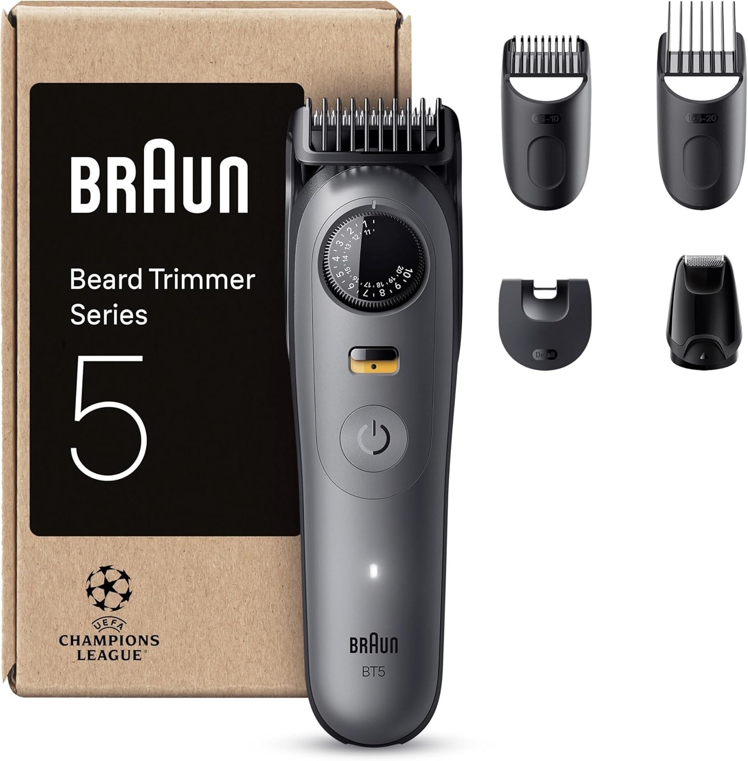 Braun Beard Trimmer Series 5, +5 Styling Tools, Ultra Sharp Blade, 120 Min Runtime, 40 Lengths, Waterproof, PrecisionWheel & Lock, BT5525, Grey