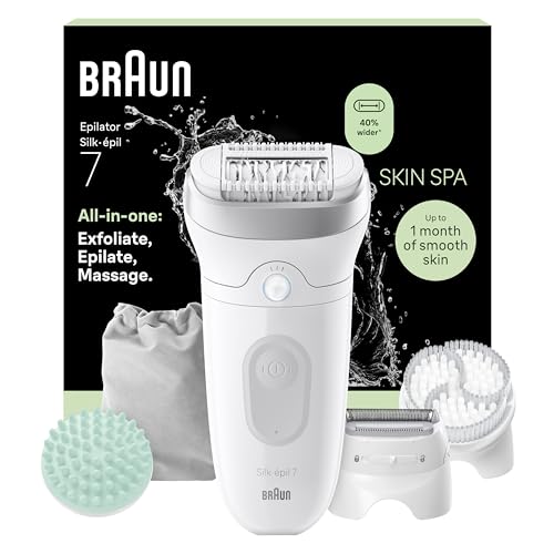 Braun Silk·épil 7 SkinSpa, All-in-One Set, Epilator with Wide Head for Easy Hair Removal, Wet & Dry, Lasting Smooth Skin, Includes Massage Pad, Shaver Head and Trimmer Comb, 7-081, Silver