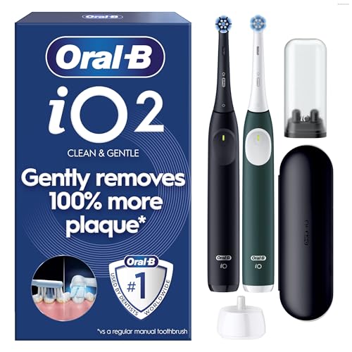 Oral-B iO2 Duo Electric Toothbrushes, 2 Gentle Care Toothbrush Heads, 1 Travel Case, 1 Travel Refill Holder, Toothbrush for Adults (Night Black and Forest Green), Designed by Braun, 2 Pin Plug