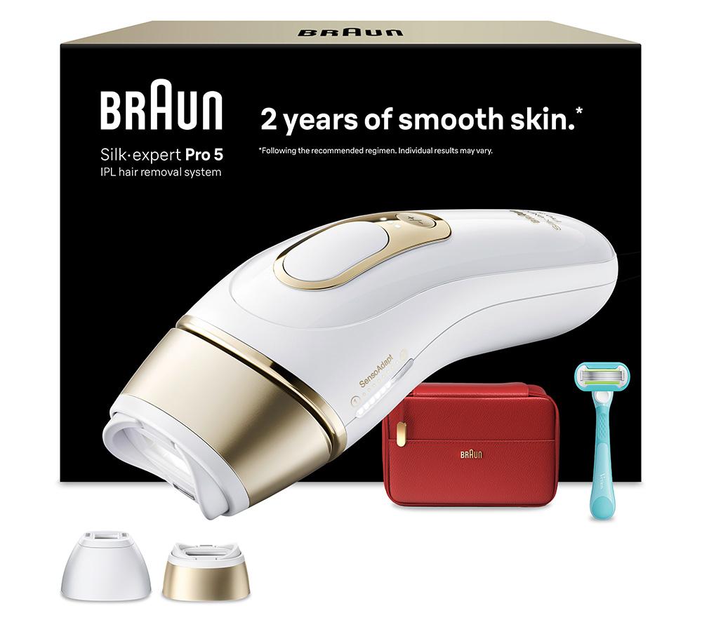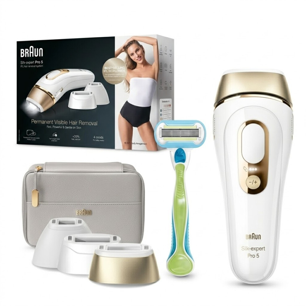 Braun IPL Silk-Expert Pro 5, at Home Hair Removal, Alternative for Laser Hair Removal, Includes Pouch, Venus Razor, Precision Head, 2 Years of Smooth Skin, Gift for Women, White/Gold, PL5138