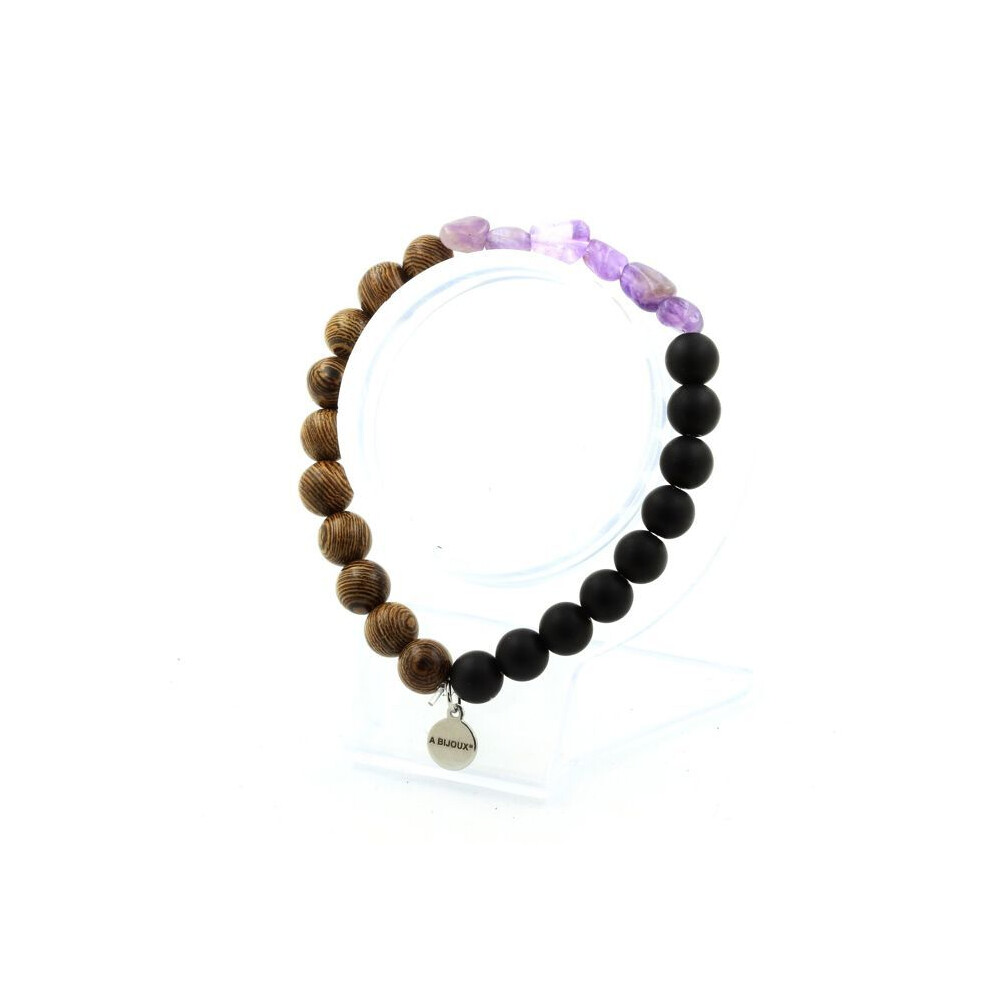 Stones and Minerals. Brazilian Amethyst Bracelet + Matte Black Onyx Beads + 8 mm wood. Made in France.