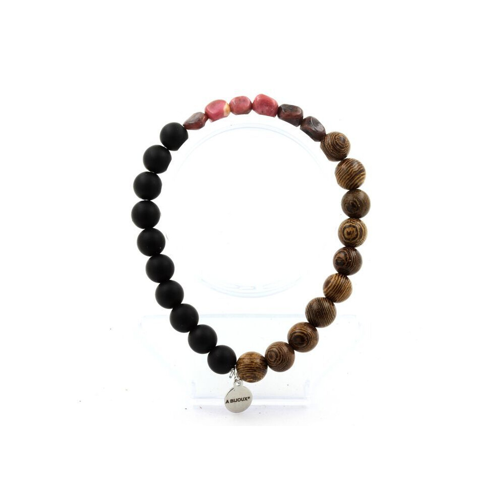 Stones and Minerals. Brazilian Rhodochrosite Bracelet + Matte Black Onyx Beads + 8 mm wood. Made in France.