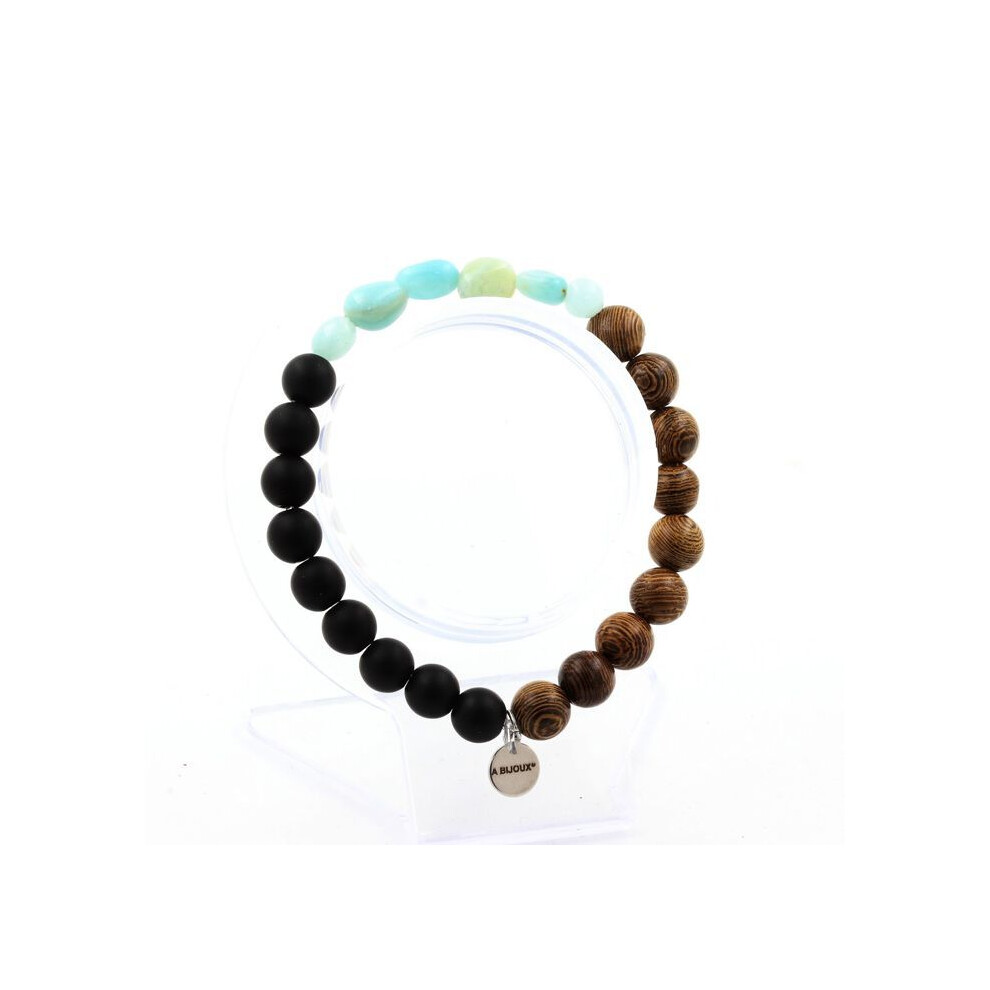 Stones and Minerals. Brazilian Amazonite Bracelet + Matte Black Onyx Beads + 8 mm wood. Made in France.