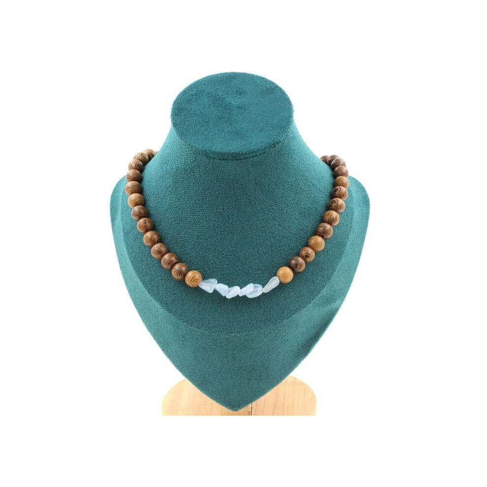 Stones and Minerals. Brazilian Aquamarine pearl necklace + 8 mm wood. Steel chain Necklace for women, men. Custom size