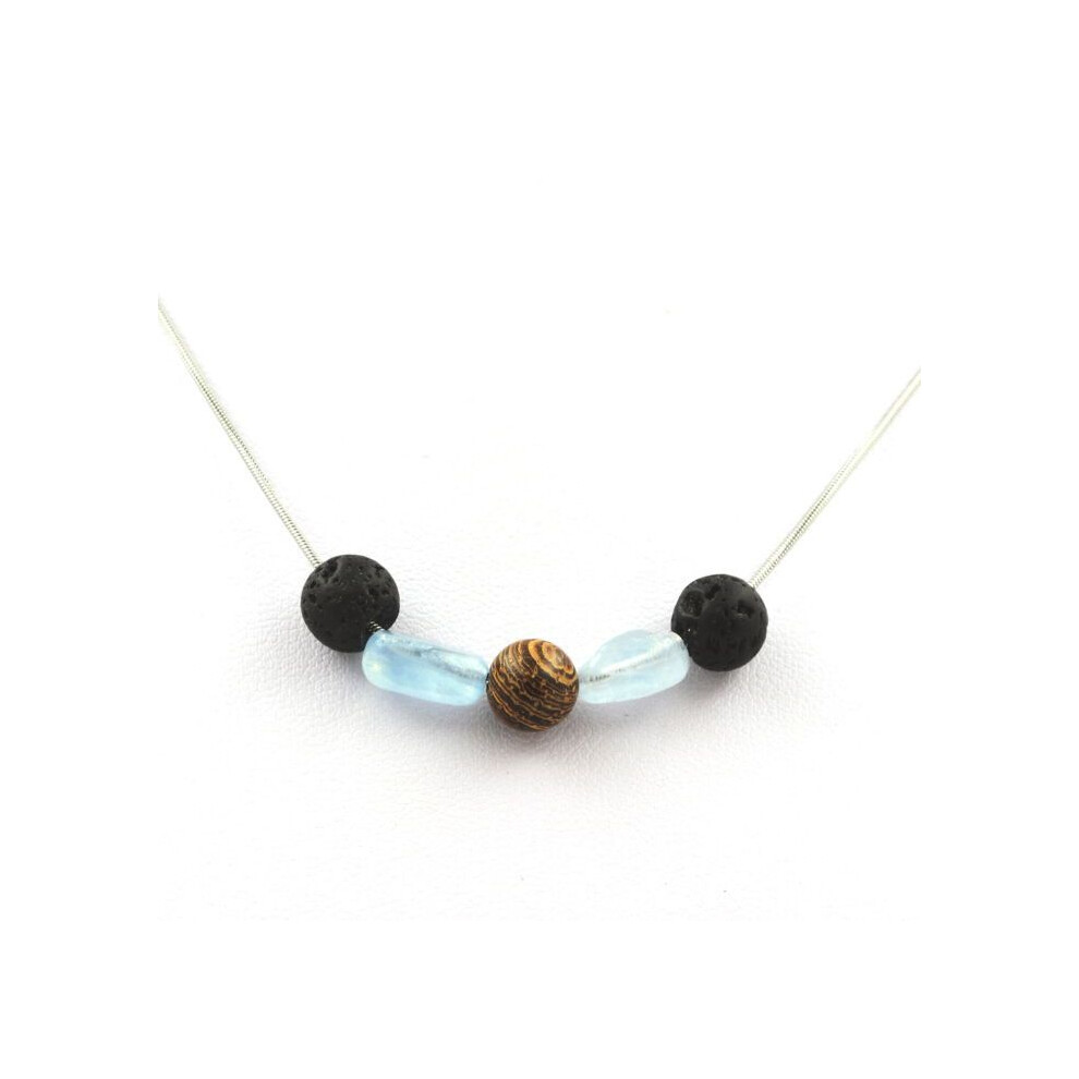 Stones and Minerals. 8 mm Lava pearl necklace + Brazilian Aquamarine + wood Stainless steel chain.
