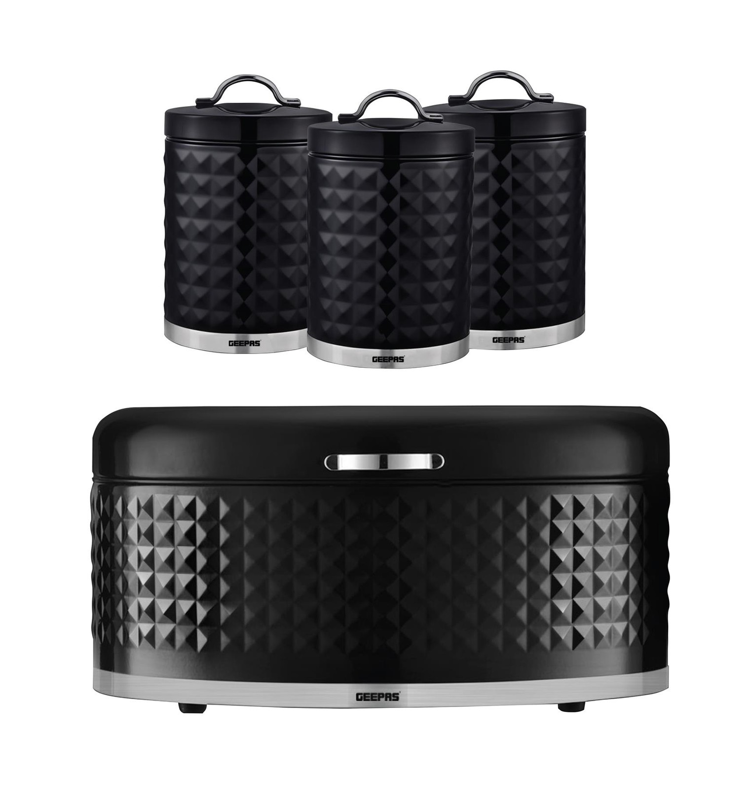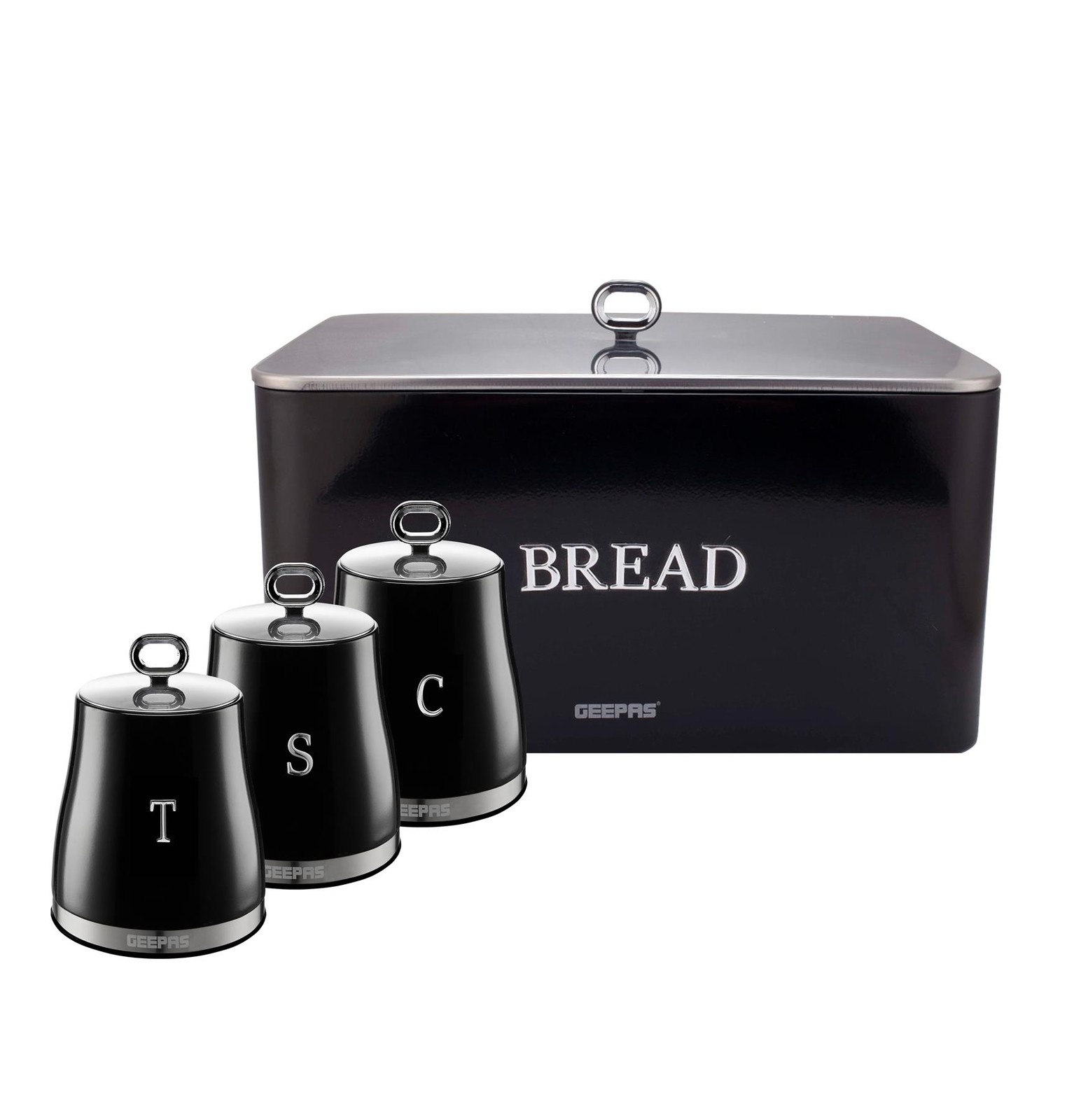 GEEPAS 4 Pc Tea Coffee Sugar Canister 1.3L & 9L Bread Bin Set Argyle Black