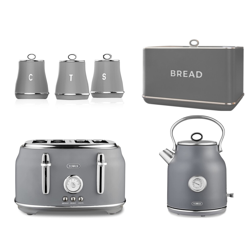 TOWER Empire Jug Kettle 4 Slice Toaster & Bread Bin Matching Kitchen Set in Grey