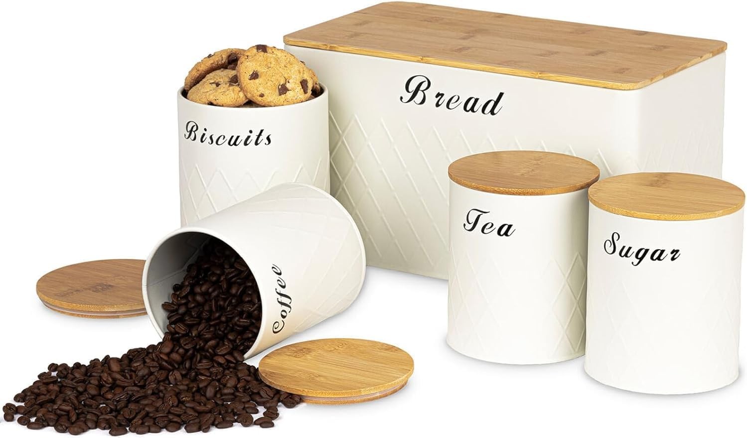 ATEK Bread Bin and Canisters Set 5 Piece Cream Kitchen Storage Tins with Bamboo