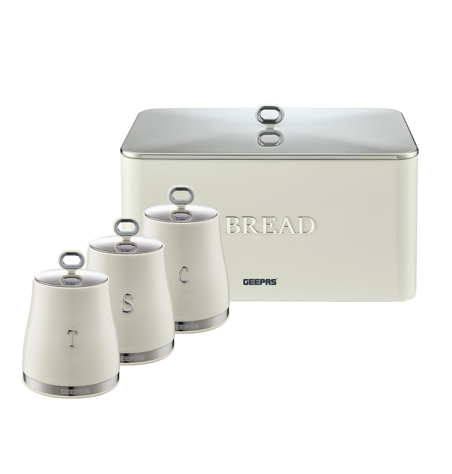GEEPAS 4 Pc Tea Coffee Sugar Canister 1.3L & 9L Bread Bin Set Argyle Cream