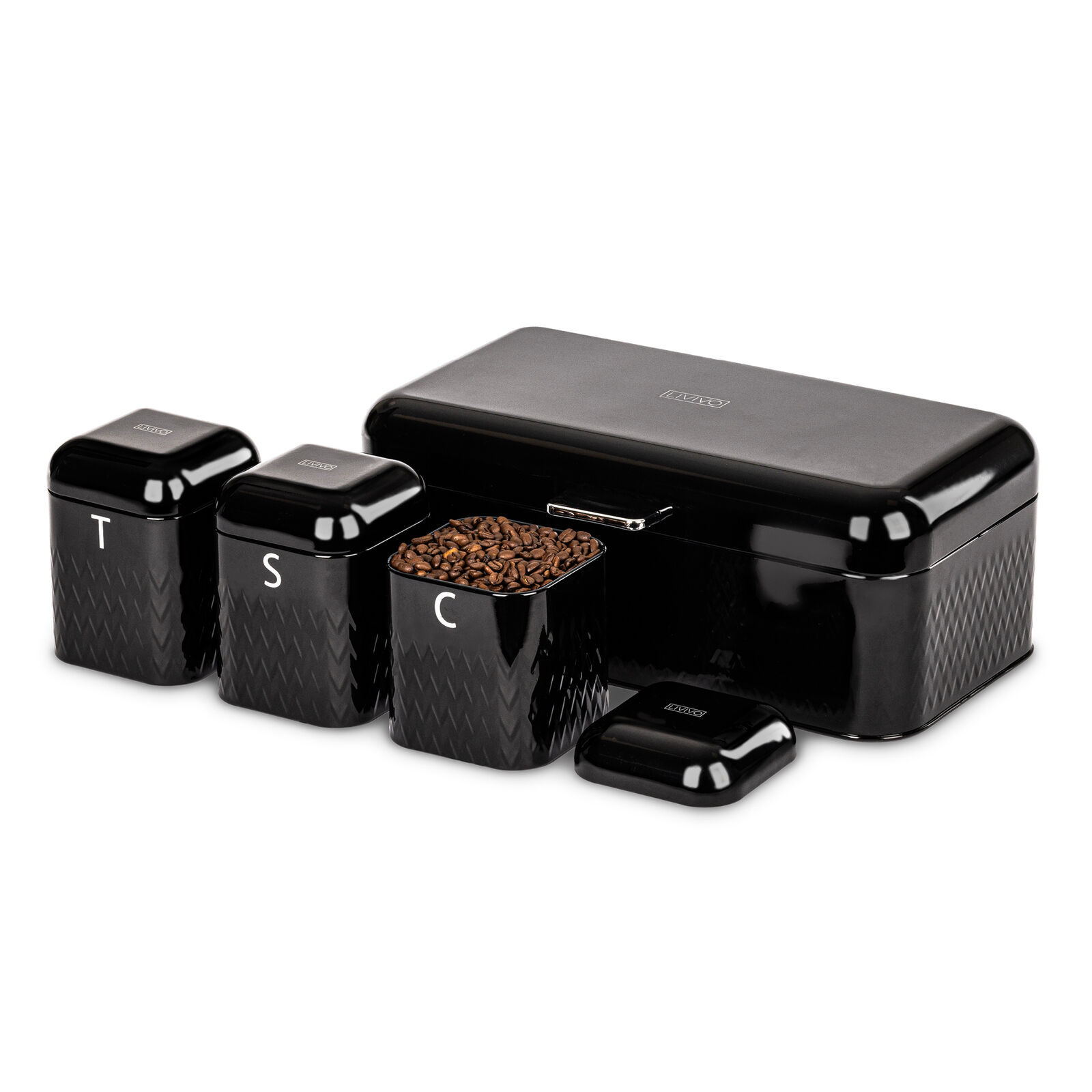 Salter BW12614EU7 Kuro 4 Piece Kitchen Storage Set - Large Bread Bin With Lid, Set Of 3 Canisters, Tea, Coffee, Sugar Caddy, Black Powder Coated Finish, Long Lasting Freshness, Easy Clean