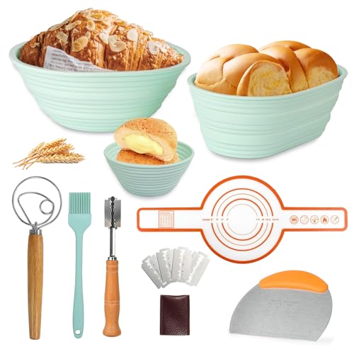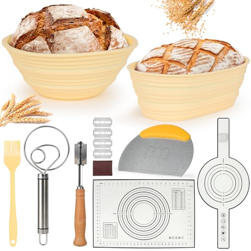 HUIJUTCHEN Sourdough Bread Baking Supplies, Sourdough Starter Kit 9 inch Round & 10 Oval Silicone Bread Basket with Silicone Bread Sling, Bread Lame, Bread Whisk, Dough Cutter & Oil Brush