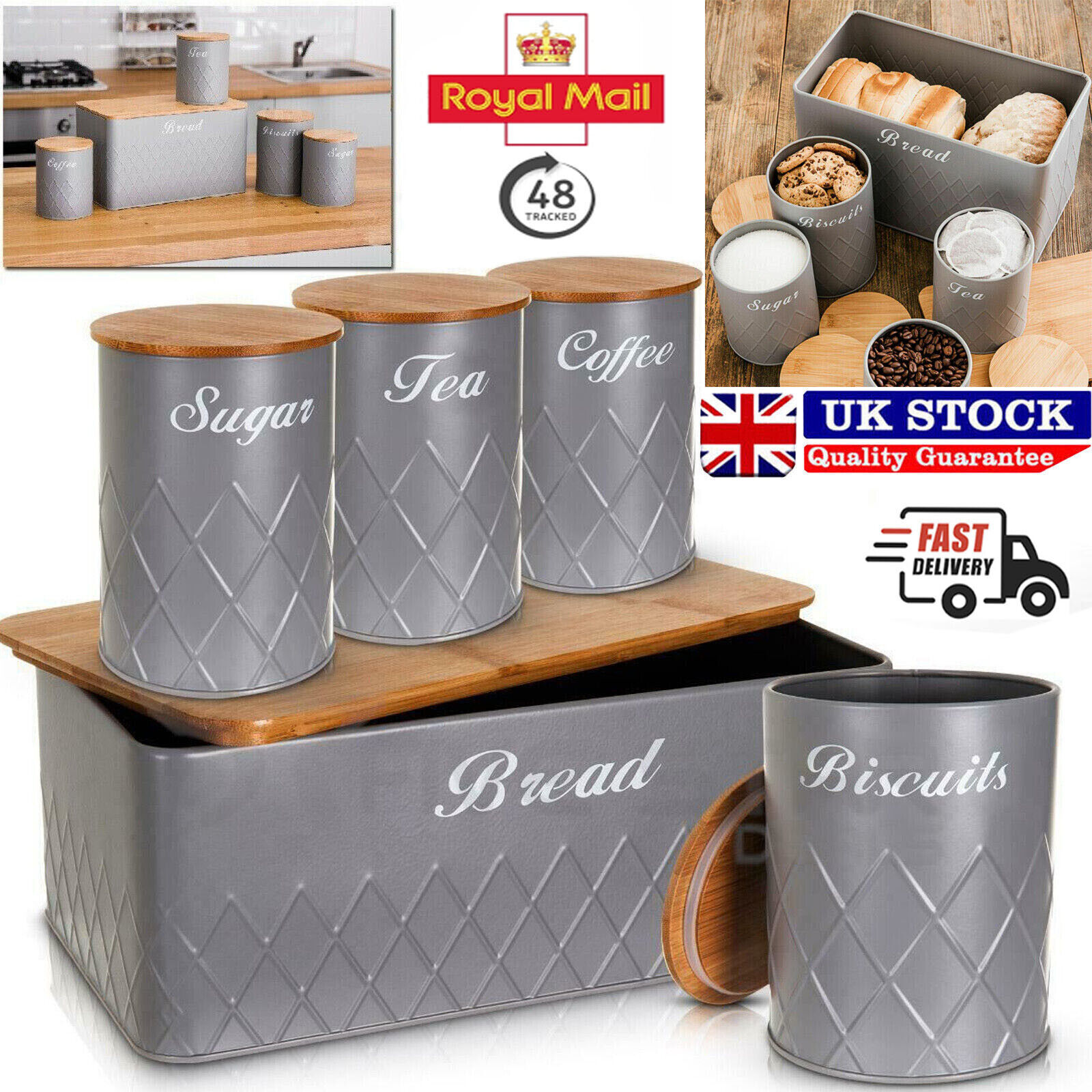 5 Piece Kitchen Storage Jars Coffee Tea Sugar Bread Tins Canisters Bamboo Lids