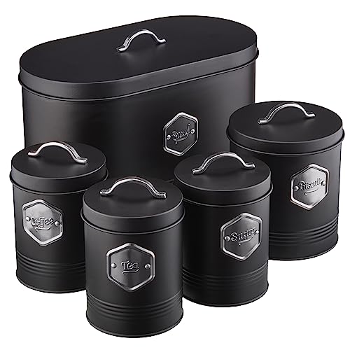 Cooks Professional 5 Piece Tea Coffee Sugar Bread & Biscuit Cannister Set | Labelled Storage Tins | Containers with Airtight Lids | Canisters for Kitchen Accessories & Essentials | Black & Silver