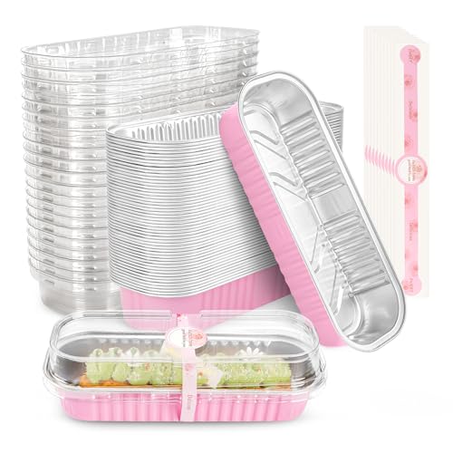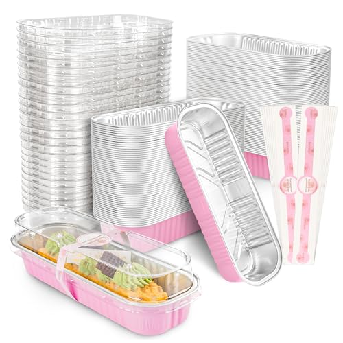 BTSD-home 50 Pack Mini Loaf Cake Cases with Lids and Spoons,Rectangular Aluminum Foil Bread Pan,Mini Loaf Pans and Mini CakeTins with Lids 200ML(Pink,6.8oz)