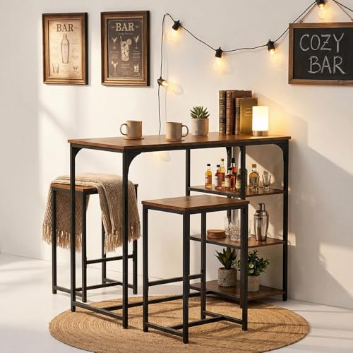 FurnitureR Industrial Bar Table Set with Storage Shelves, Space-Saving Breakfast Bar Table and Stool, Rustic Brown Wood Top with Black Metal Frame for Kitchen, Dining Room, Home Bar