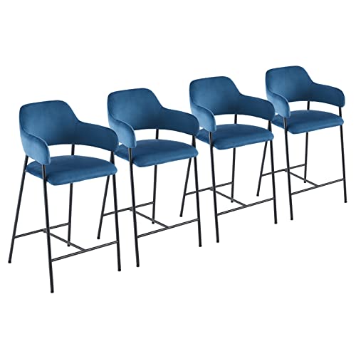 CLIPOP Bar Stools Set of 4, Blue Velvet Padded Breakfast Bar Chairs with Armrest and Black Matt Metal Legs, High Back Dining Stools for Kitchen Counter Island Pub