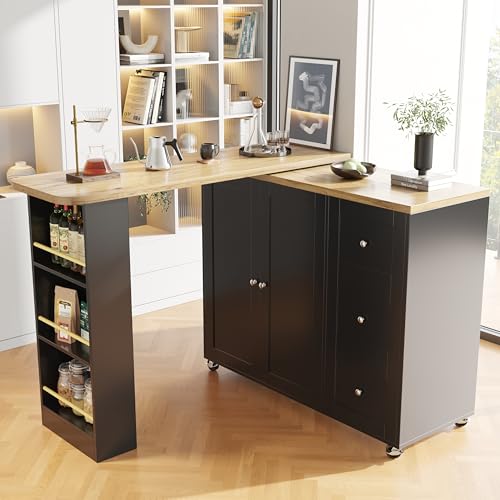 BTM Free Standing Kitchen Island with Extendable Dining Table for 4-6 Kitchen Breakfast Bar Table with Storage Cabinet, Shelves Black