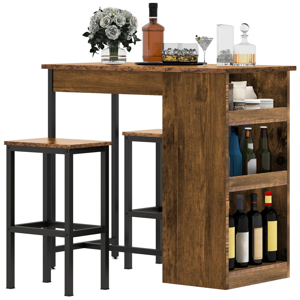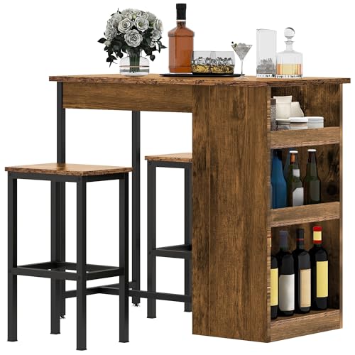 Aptliton 3 Piece Bar Table and Chairs Set, Kitchen Breakfast Bar with Storage Shelves, Industrial High Top Dining Table with 2 Stools, Space Saving Pub Counter with Wine Rack for Small Space