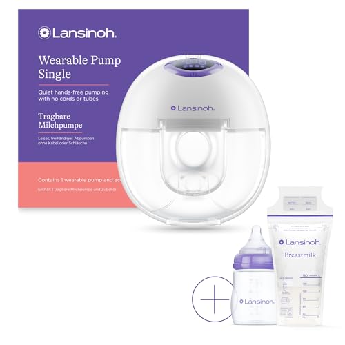 Lansinoh Wearable Electric Breast Pump Bundle - 4 Pumping Modes, 9 Suction Levels - Hands Free Portable & Quiet Pumping- LED Display - Includes 25 Breast Milk Storage Bags + Feeding Bottle (1 Pumps)