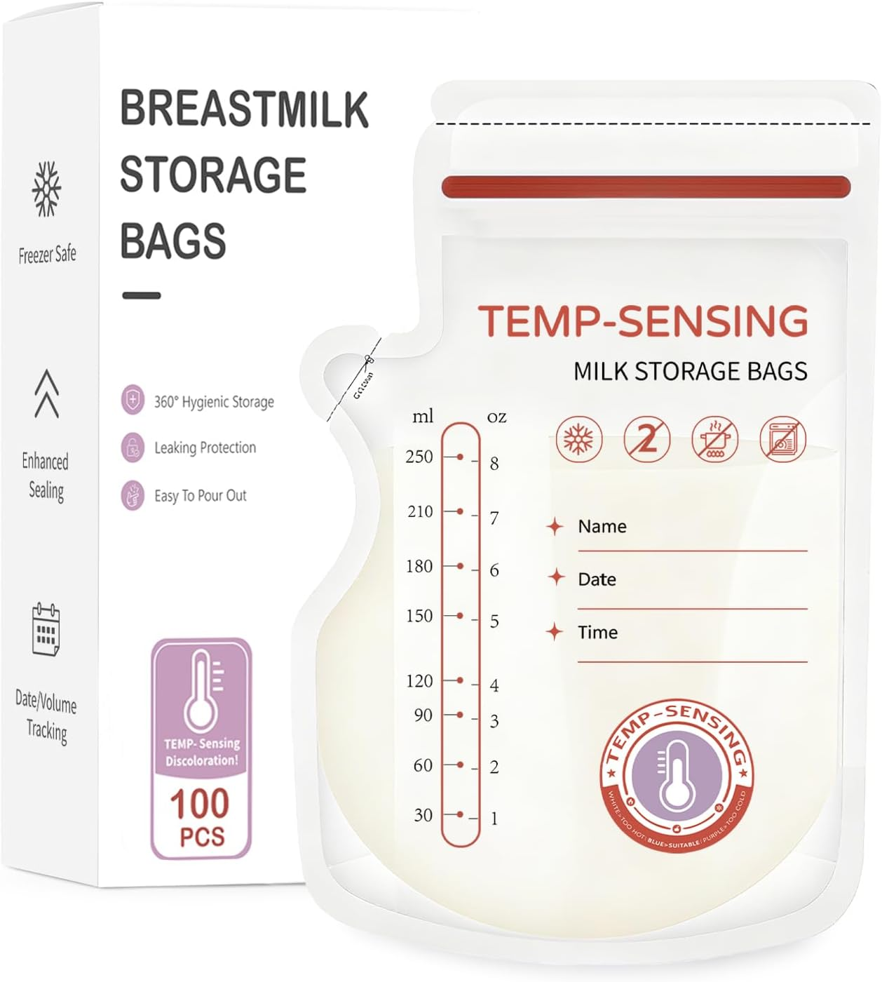 100Pcs Temp-Sensing Breast Milk Storage Bags- 250Ml Milk Storage Bags for Breast