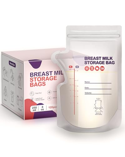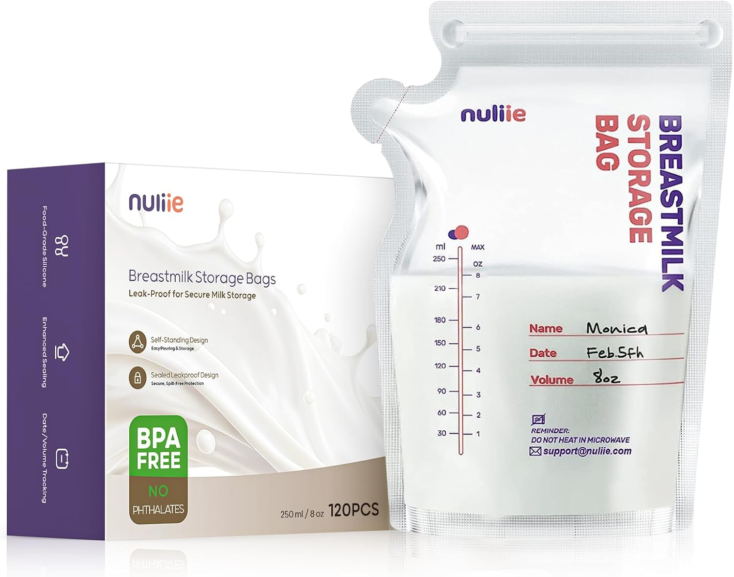 Nuliie 120 Pcs Breast Milk Storage Bags, 250ml BPA Free Milk Storage Bags with Pour Spout for Breastfeeding, Self-Standing or Flat Pre-sterilised Bag, Space Saving for Fridge or Freezer Use