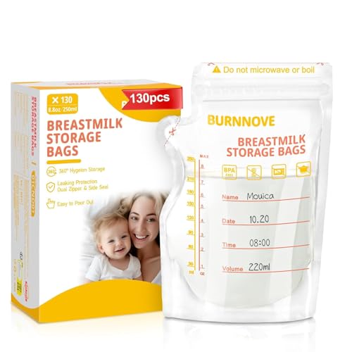 BURNNOVE Breast Milk Storage Bags 130 Pack 250ml BPAFree Leakproof Double Zipper UltraDurable with EasyPour Spout WriteOn Labels