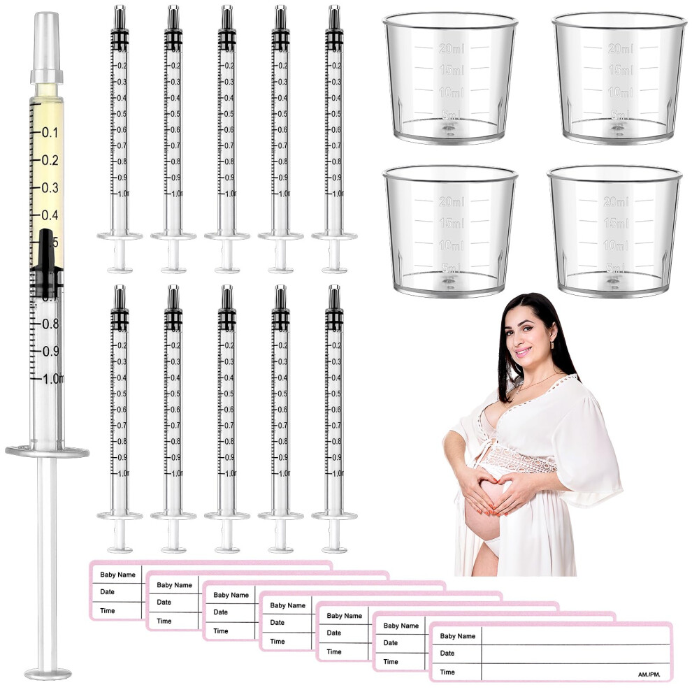 50 Pcs Colostrum Collector Kit 1ml Breast Milk Collector Milk Catcher with 4 Measuring Cup and 54 Stickers Colostrum Collection Gift Set Colostrum Ha