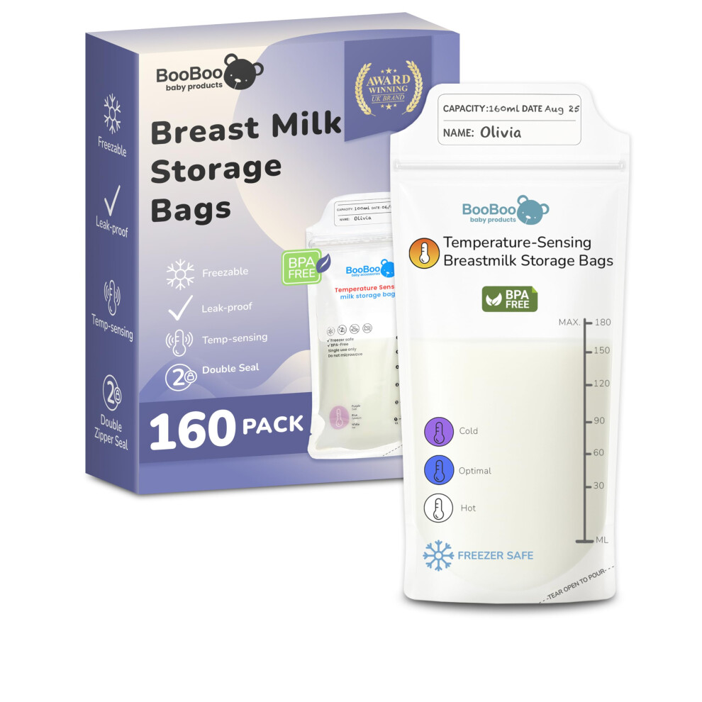 Booboo 160 Pack Breast Milk Storage Bags, Temp-Sensing Breastmilk Storing Bag, Self Standing, No-Leak Milk Freezer Suitable Storage Pouches for Brea