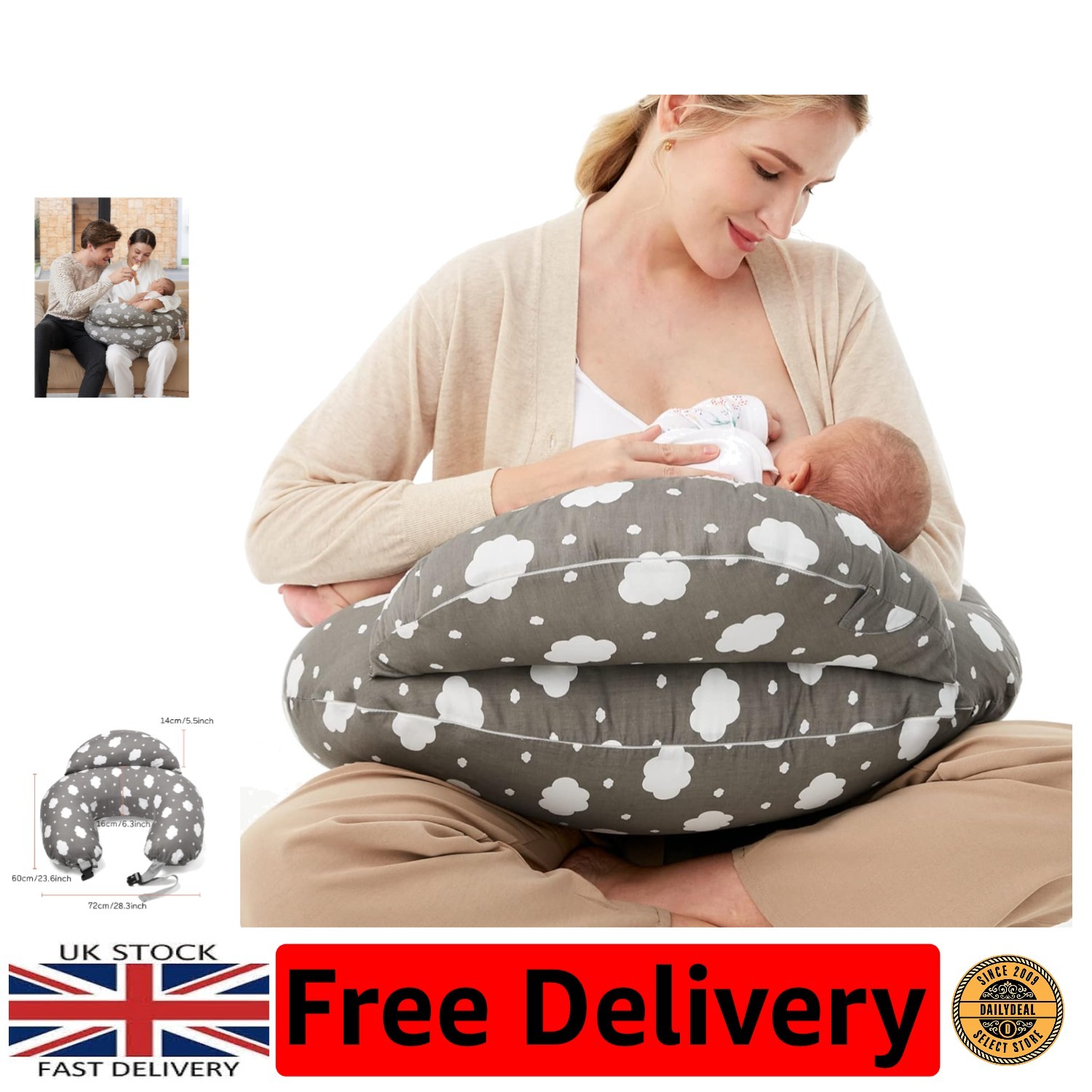 SHANNA Nursing Pillow Bottle Feeding Breastfeeding Pillow, Multifunctional Nursing Pillow with 100% Cotton Romvable Washable Cover Adjustable Waist Strap Support, Gifts for Pregnancy(Grey Clouds)