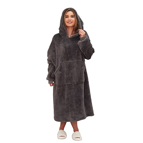 Brentfords Extra Long Teddy Fleece Blanket Hoodie Oversized for Women Men Adult Wearable Throw Soft Giant Sweatshirt, One Size - Charcoal Grey