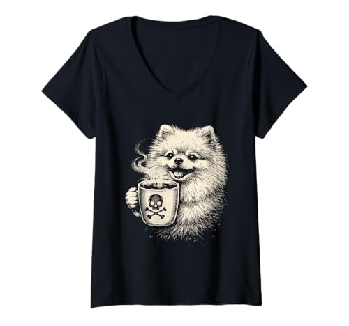 Women's Pomeranian Dog Coffee Skull Bones Morning Brew Graphic V-Neck T-Shirt