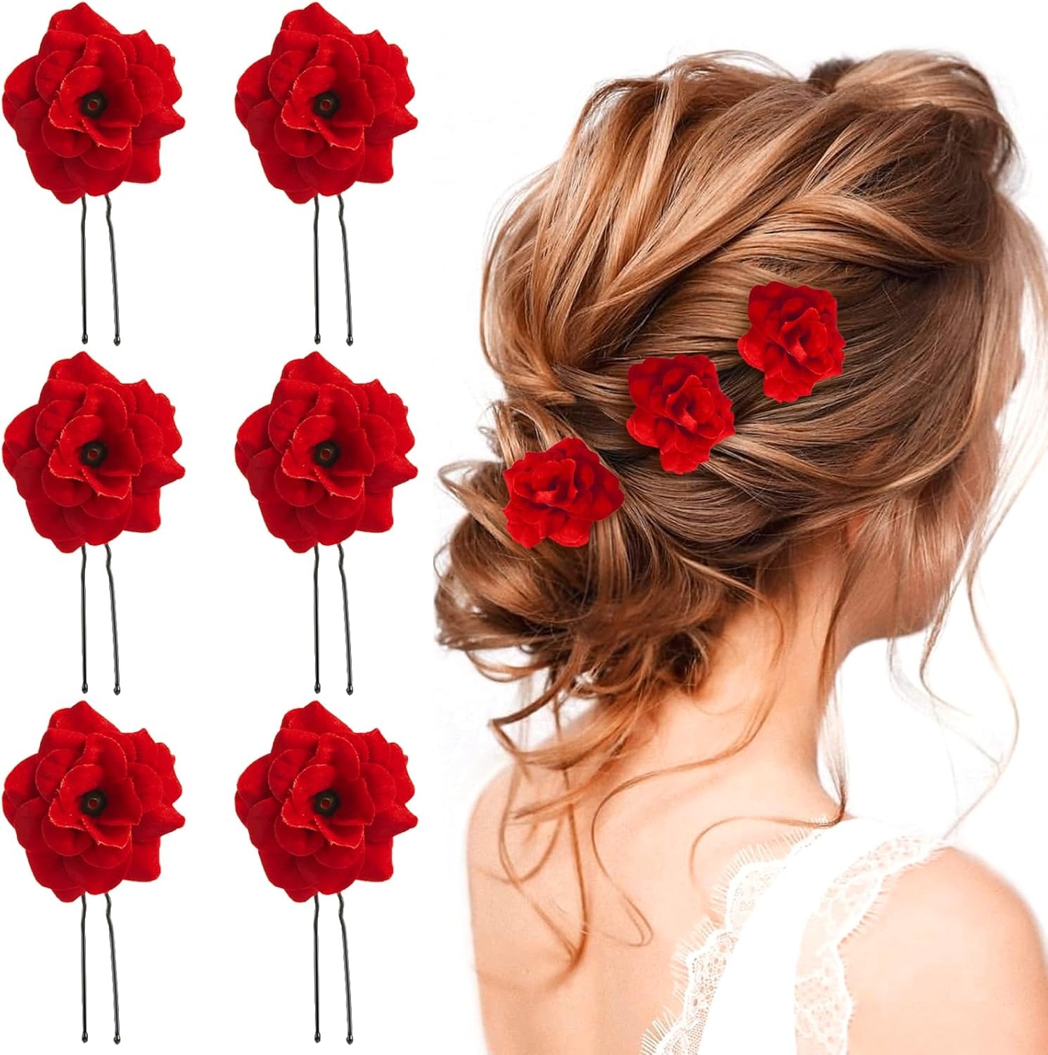 Rose Flower Hair Clips U Shape Rose Floral Bobby Pins Bridal Hair Pin Bridesmaids Head Hairpin Women Hair Accessories for Bridal Wedding Party (Red, 6pc)