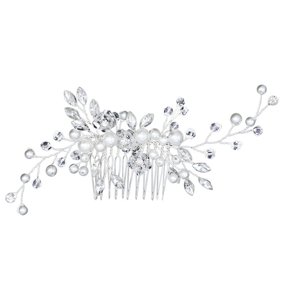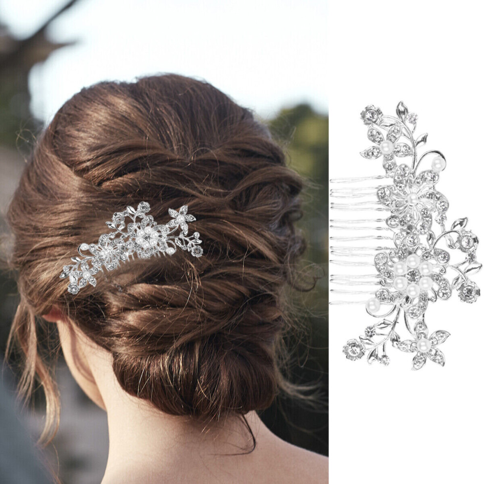 (Silver) Wedding Bridal Hair Accessories Comb Clips Piece Crystal Diamante Pearls Flower