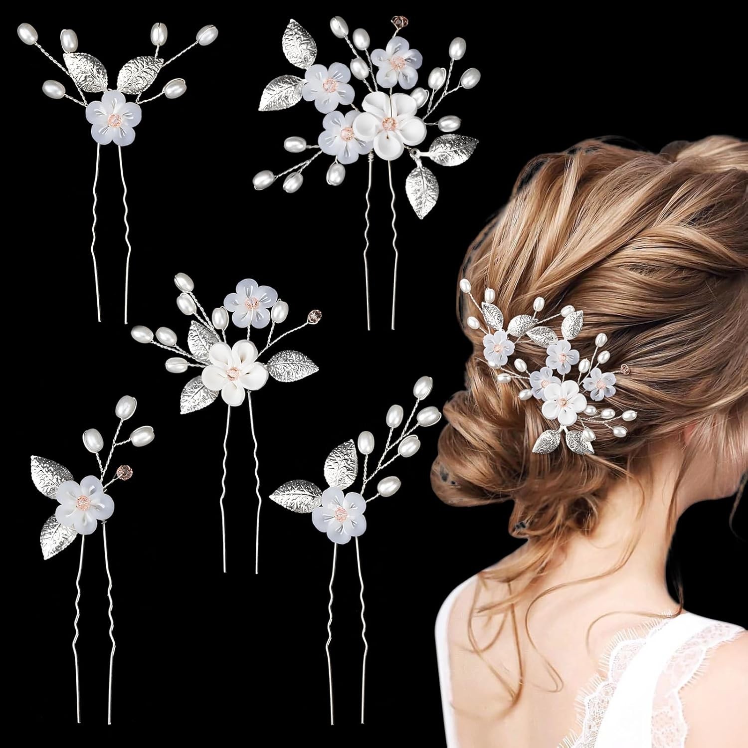 MELLIEX 5 Pcs Bridal Hairpins, Pearl Rhinestone, Flower Hair Clips, Silver Jewe