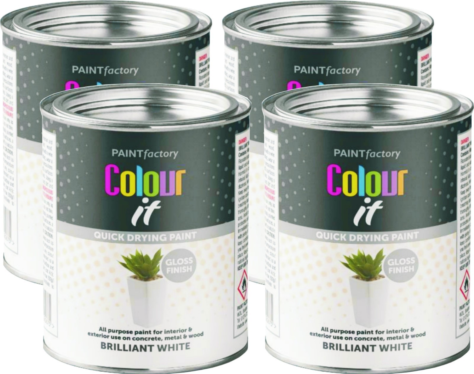 4 x Paint Factory Brilliant White Gloss Tin Paint Fast Drying 300ml