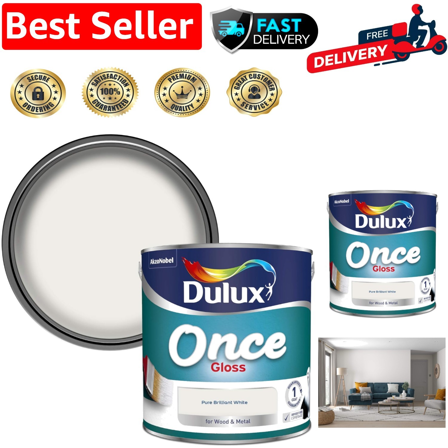 Pure Brilliant White Once Gloss Paint - 2.5L, One Coat Coverage for Wood & Metal