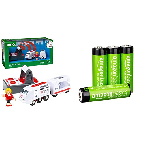 BRIO World Remote Control Travel Train Toy for Kids Age 3 Years Up & Amazon Basics AA Rechargeable Batteries, Pre-charged - Pack of 4 (Appearance may vary)