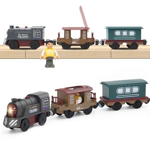 SGZIOO Battery Trains for Wooden Track, 3 Pcs Magnetic Retro Battery Powered Train with Sound and Light, Electric Train Compatible with Thomas and Brio as Gifts for Adults