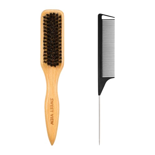 SWEET VIEW Boar Bristle Slick Back Hair Brush for Smooth Flyaways, Frizz, Sleek Ponytail, Buns and Edge Baby Hair, Teasing | Gel Comb, Styling Accessories for Girls, Kids and Women