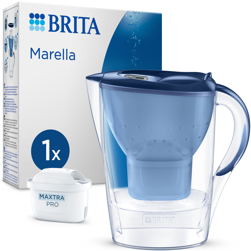 Brita Marella Water Filter Jug, Blue, 2.4 L, with 1x MAXTRA PRO Pure Performance Cartridge - Fridge-Fitting with Digital LTI & Flip-Lid; Reduces Chlorine, Limescale & Impurities