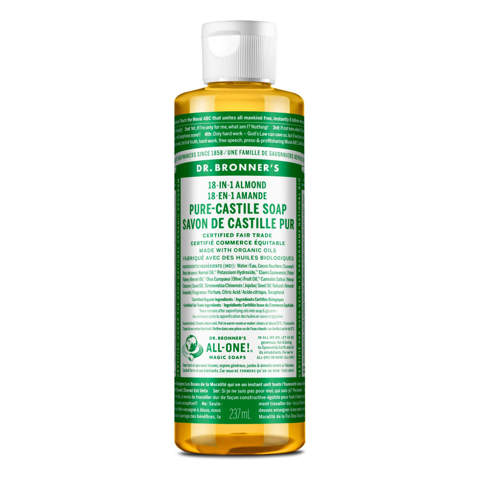 Dr. Bronner's - Pure-Castile Liquid Soap (Almond 8 ounce) - Made with Organic Oils 18-in-1 Uses: Face Body Hair Laundry Pets and Dishes Concen
