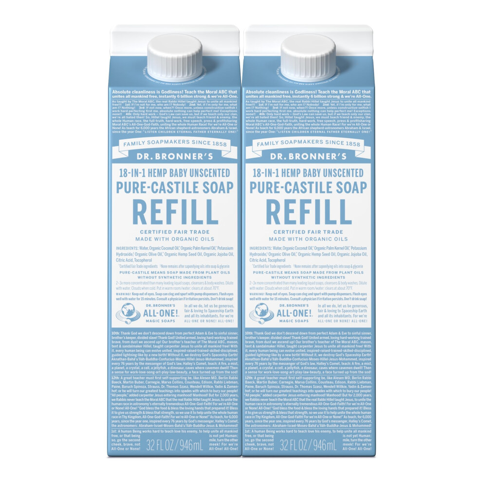 Dr. Bronner's Pure-Castile Liquid Soap Refill (Baby Unscented 32oz Pack of 2)